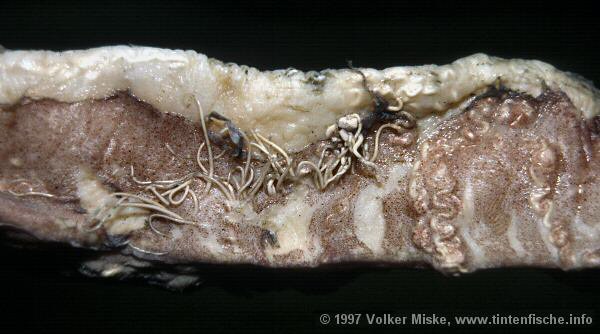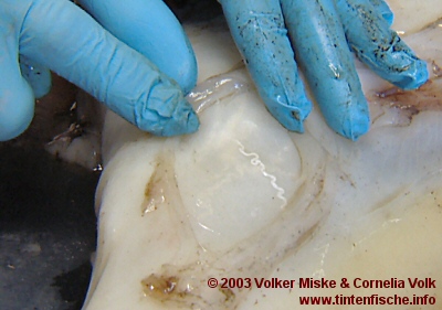Abb. 3: Stralsunder Exemplar. Nahaufnahme des Bereich mit implantierten Spermienbehältern. Oberste Hautschichten entfernt; eine weiße, schlangenartig gewundene Spermatophore zuoberst, weitere in tieferen Schichten liegend. Weder Arme, Tentakel noch Kopf wiesen implantierte Spermienbehälter auf.